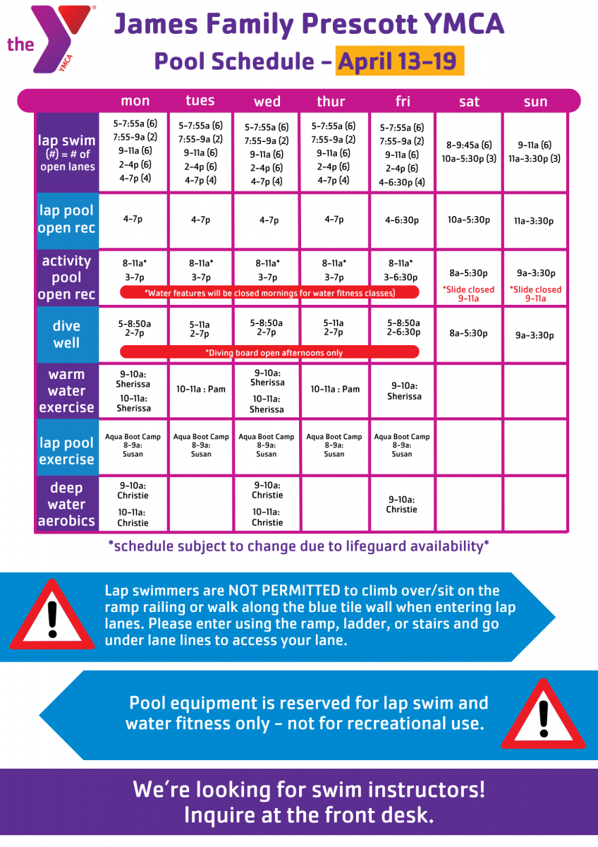 *Times are subject to change, particularly in the afternoon, due to lifeguard availability and Prescott High School Swim homes meets. Please feel free to call the front desk at 928.445.7221 ext. 238.